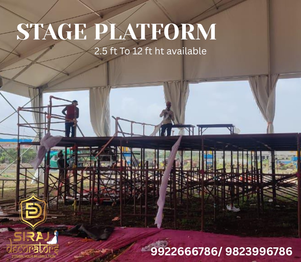 Siraj Decorators provides end-to-end stage platform rental services—covering design consultation, layout planning, on-site installation, and post-event dismantling. Beyond stages, we also supply complementary infrastructure like trussing, lighting, flooring, barricades, and sound systems, ensuring your event setup is managed under one roof with flawless execution.